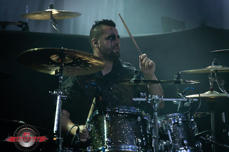 Das Theme von „Terminator 2“ erklingt, ein Jubelsturm bricht los, die Band kommt auf die Bühne und steigt mit „Shock“ erwartungsgemäß ein. Gehen wir zuerst auf die zweite Frage ein. Dino sieht ein wenig verbraucht aus, vielleicht liegt es an den Tour Strapazen, vielleicht ist auch er körperlich etwas angeschlagen. Nichtsdestotrotz zeigt er sich in Feierlaune und spielfreudig.