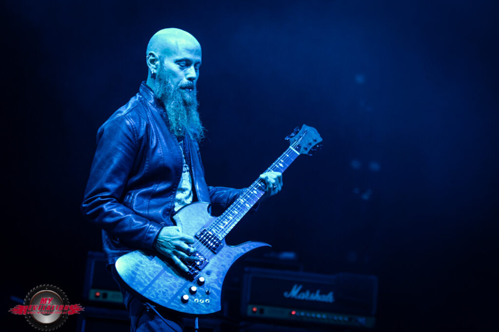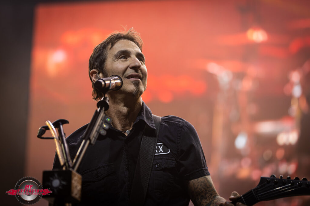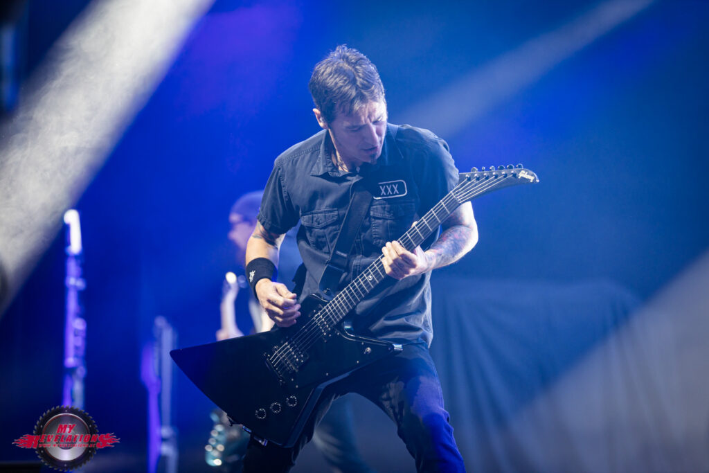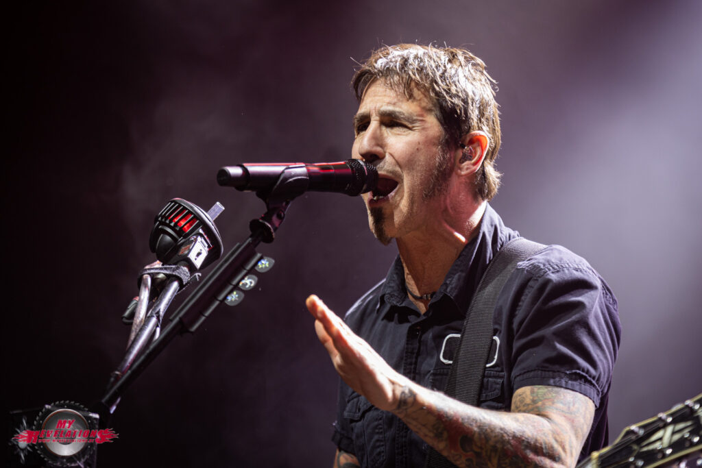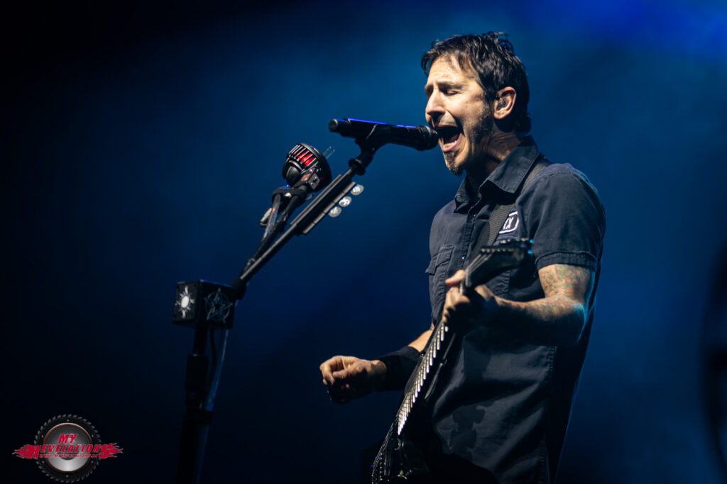 Kurz darauf entern Sully Erna und seine Mitstreiter die Bühne und legen mit „Surrender“ und „You And I“ direkt los. Die Zuschauer sind begeistert, und auch die Video Leinwand läuft weiter so dass man auch von ganz hinten dem Geschehen auf der Bühne folgen kann.