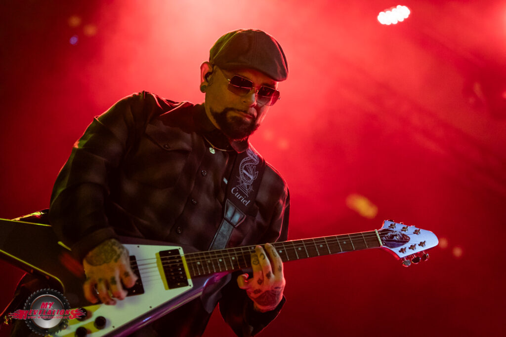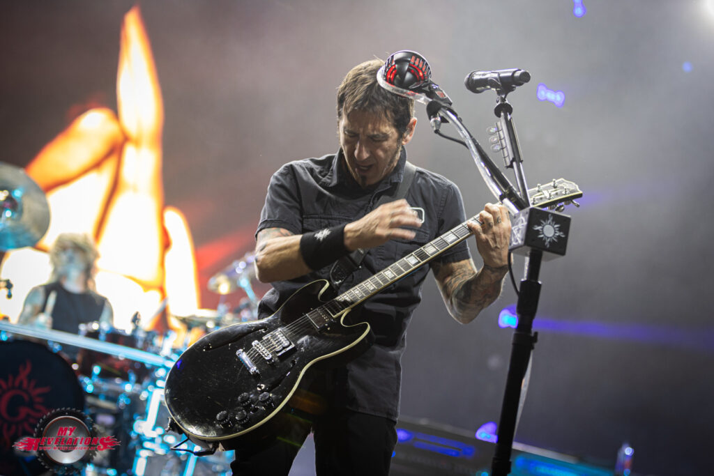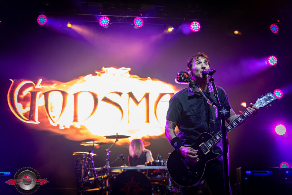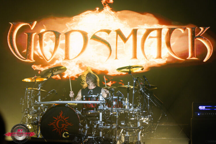 Wie heutzutage so üblich wird die Bühne für den Headliner Umbau verhüllt. Um das vorweg zu nehmen: der Grund dafür erschließt sich mir nicht wirklich, gibt es doch keine gigantischen Bühnenaufbauten oder sonstigen Tinnef der das rechtfertigt. Sei es drum, gut 30 Minuten später wird der Lautstärkeregler nach oben gefahren und der Vorhang verschwindet. Eine sehr große Video Leinwand hinter der Bühne zeigt einen DJ der allerlei Klassiker anspielt bzw. auflegt. Als das Publikum dann ordentlich angeheizt ist gibt es einen Schnitt, und plötzlich sehen wir GODSMACK wie sie sich live aus dem Backstage Bereich auf den Weg zur Bühne machen. Coole Idee, denn das treibt die Leute nochmal ordentlich an.