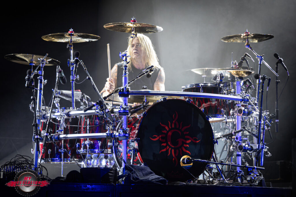 Auf der Video Leinwand werden ab und an auch Grafiken oder Effekte eingespielt, speziell bei „Voodoo“ ist das schon ein echtes Erlebnis. Nach dem Song bekommt dann Sully Erna die Chance seine Schlagzeugkünste unter Beweis zu stellen, liefert er sich mit Will Hunt eine Art Drum Battle und die beiden spielen jede Menge Evergreens wie „Back In Black“ oder „Enter Sandman“ an. Eine schöne Auflockerung.