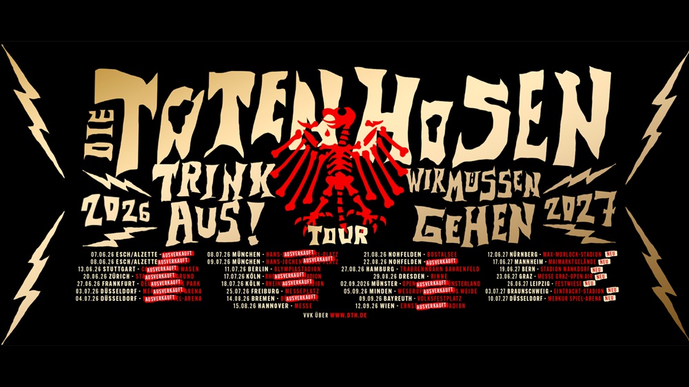 DIE TOTEN HOSEN Zusatzkonzerte 2027: „Trink Aus! Wir Müssen Gehen“-Tour wird um eine Handvoll Konzerte verlängert! Die Vorfreude ist riesig: Fast 900.000 Fans werden auf der großen Open-Air- und Stadiontour im nächsten Sommer mit den TOTEN HOSEN feiern. Nur für wenige der 23 Termine gibt es noch einige Restkarten, alle anderen Shows sind bereits ausverkauft.